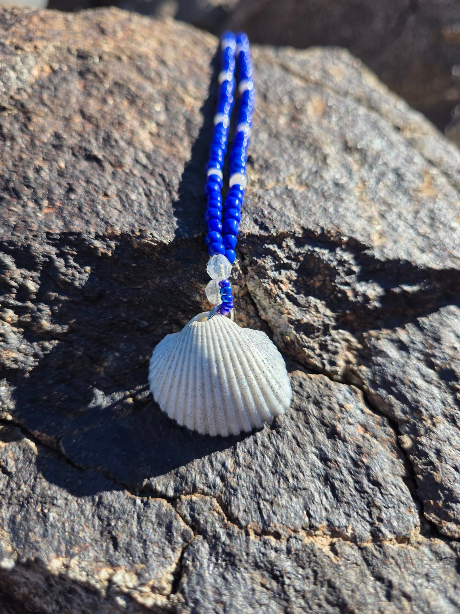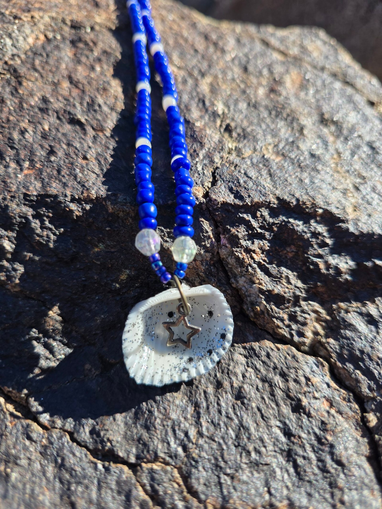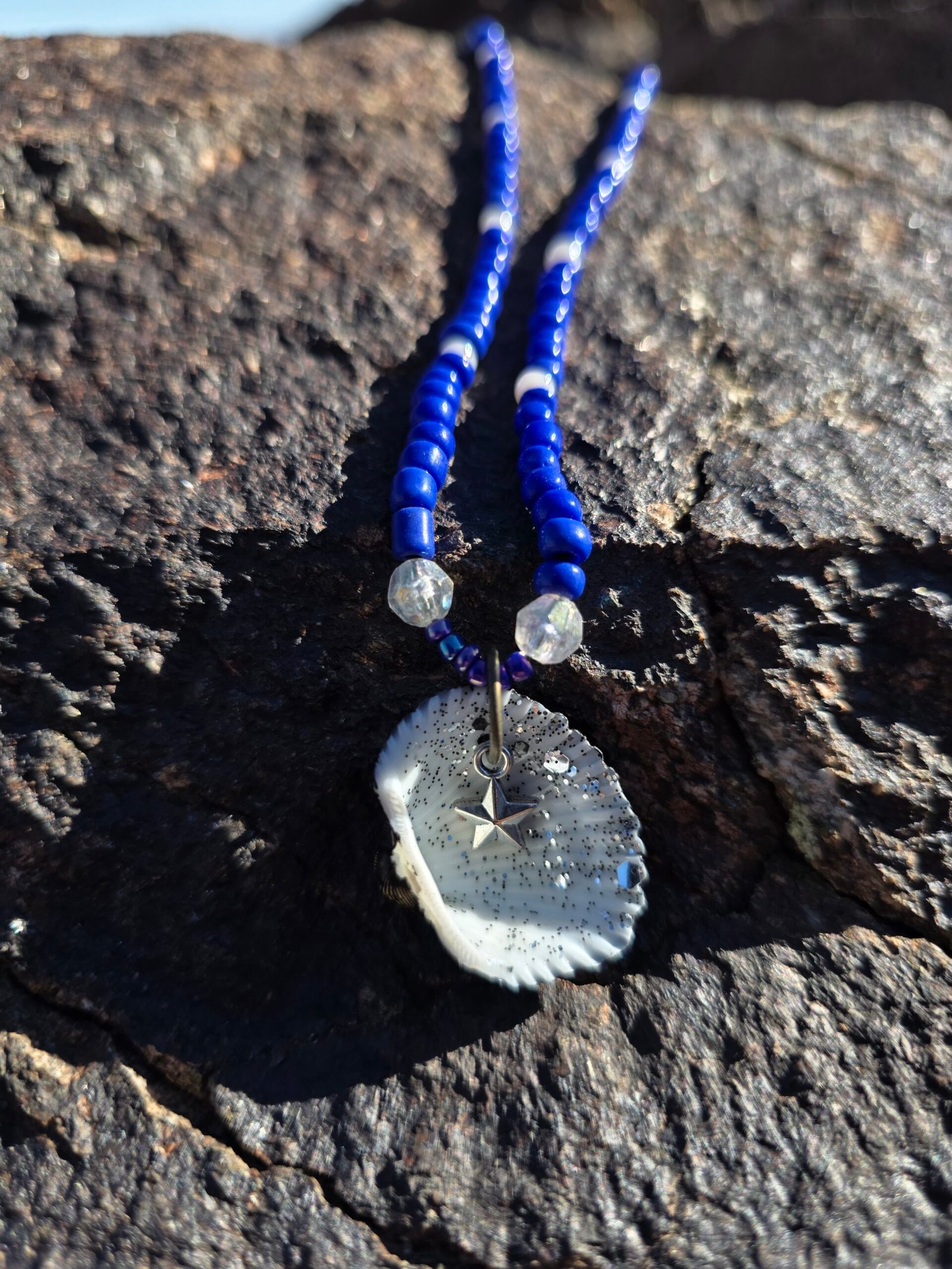 Five unique sets in this colorway. Each is one of a kind and will not be recreated. Meaning notes: reversible seashell focal for duality and self reflection. Blue beads for calm, truth, emotional balance. Clear beads for clarity and intention. Pearl tone for wisdom and softness. Metallic accents for strength and grounding. Set details: necklace 22 in, bracelet, anklet, and one matching waist bead. Waist bead can be tied for permanent wear or finished with a clasp. Materials: braided nylon string, hand painted seashell with black polish and clear black glitter, sterling silver lobster clasp, stainless steel chain tab. Charm is not removable. Craft and cleansing: made in serene natural environments, no intention infused during creation. After completion each set is saged, treated with a sound bowl, and moon finished.
