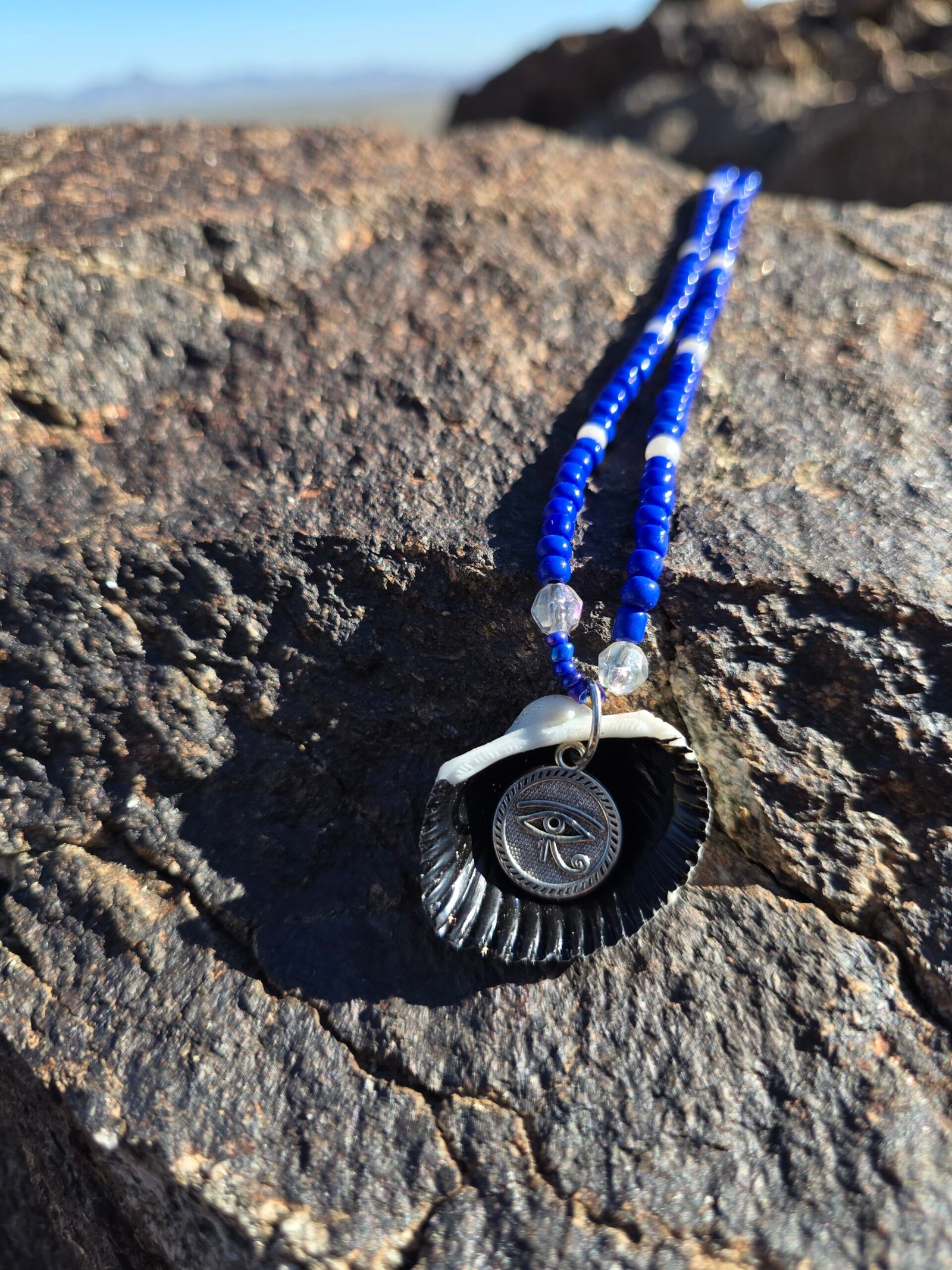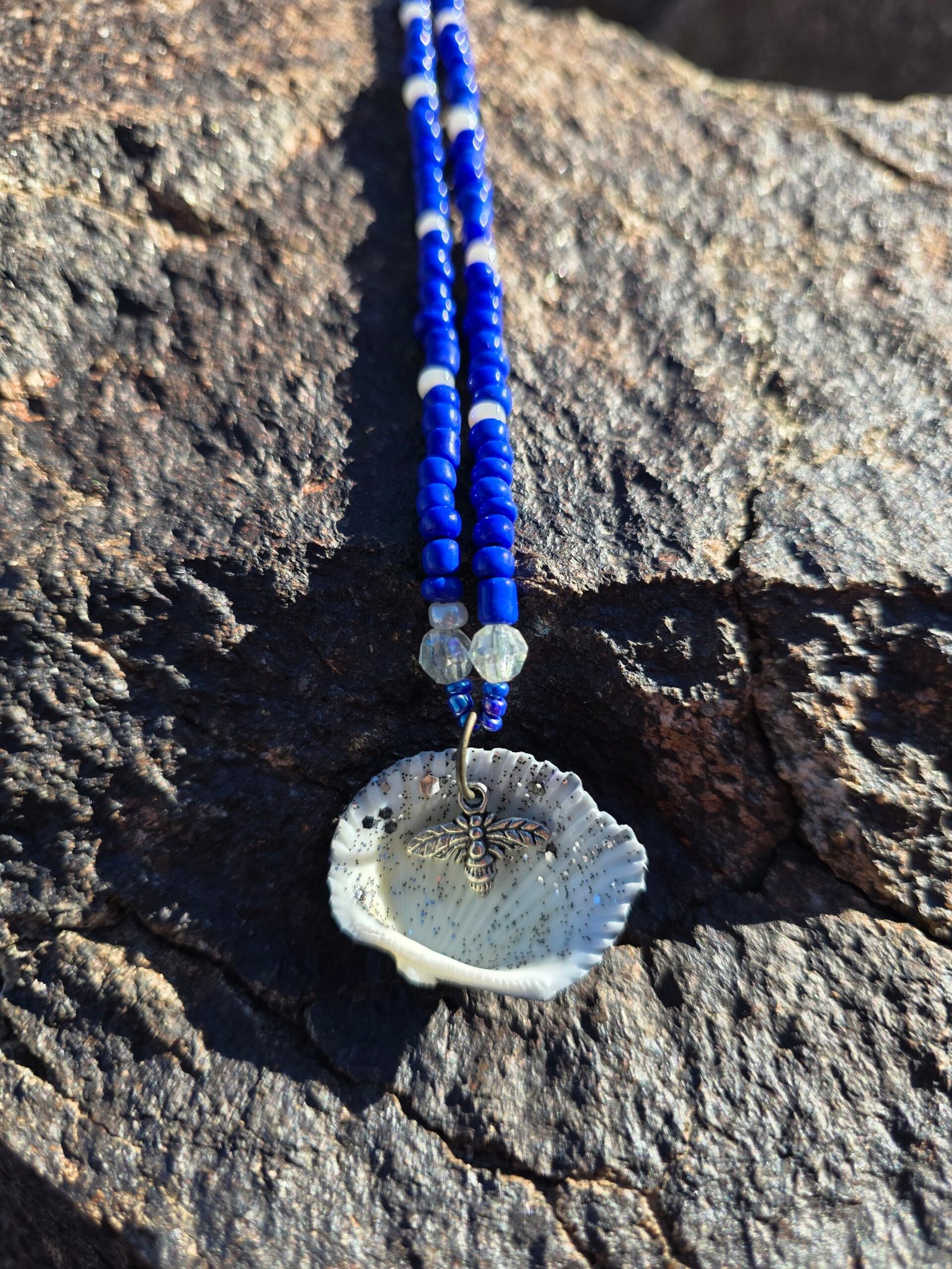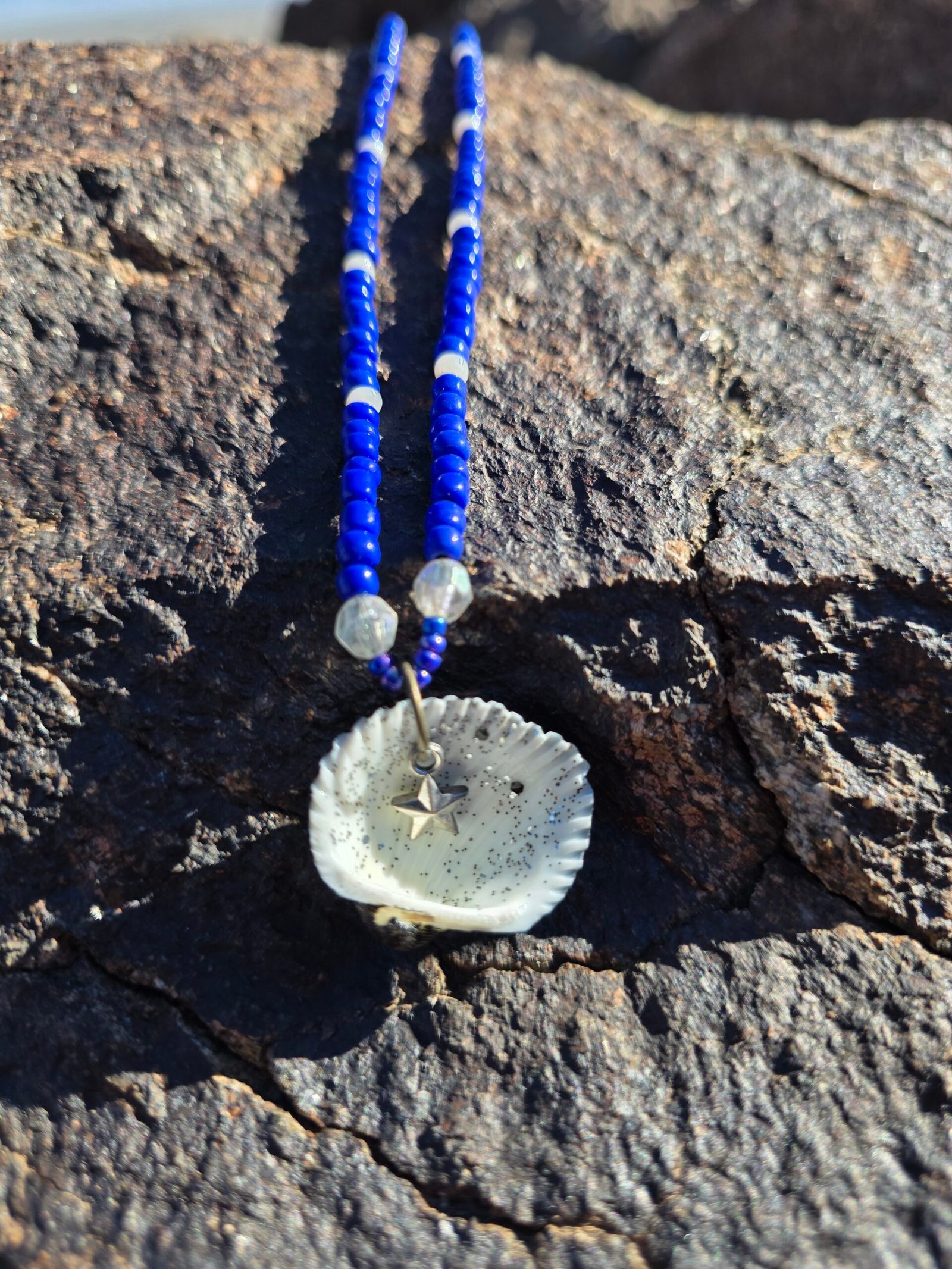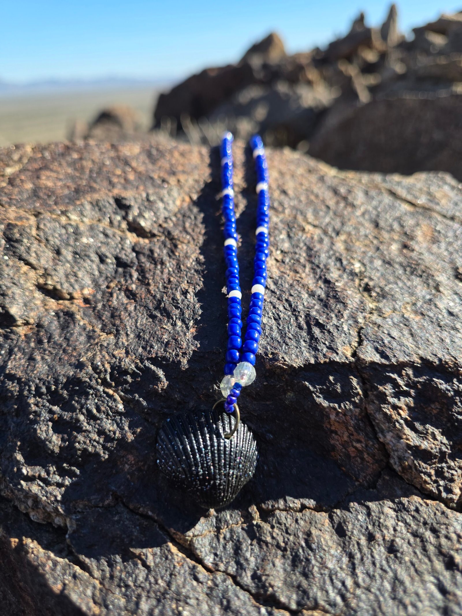 Five unique sets in this colorway. Each is one of a kind and will not be recreated. Meaning notes: reversible seashell focal for duality and self reflection. Blue beads for calm, truth, emotional balance. Clear beads for clarity and intention. Pearl tone for wisdom and softness. Metallic accents for strength and grounding. Set details: necklace 22 in, bracelet, anklet, and one matching waist bead. Waist bead can be tied for permanent wear or finished with a clasp. Materials: braided nylon string, hand painted seashell with black polish and clear black glitter, sterling silver lobster clasp, stainless steel chain tab. Charm is not removable. Craft and cleansing: made in serene natural environments, no intention infused during creation. After completion each set is saged, treated with a sound bowl, and moon finished.